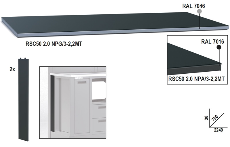 Fémlemez munkalap, 2,2 m széles, munkapadhoz, az RSC50 2.0 műhelyberendezés összeállításhoz